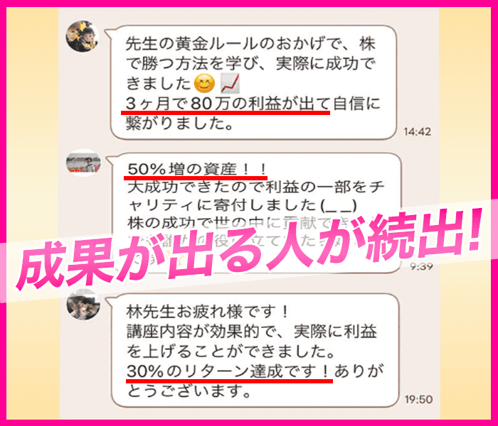 投資歴10年で、数多くの投資法、ツールを試しましたが、どれも一時的なもの…ですが、予想が外れても利益になる投資法は、運・実績・経験に左右されず、型に当てはめて、ルールに従うだけなので、とても再現性が高く感じました。 先日150万円の利益を確定したのも林先生のおかげです!