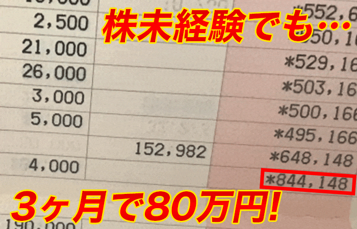 定年退職をして、年金生活をし始めたのですが、この先が不安で株投資を始めました。しかし、赤字続きでやめようと思っていた時に、外れても利益になる投資法を知り、即実践してみたら3ヶ月で利益100万円以上に! もっと若いうちから始めていたかったです(笑)